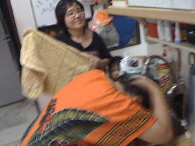 Mummy rinse her hair. There must be always someone beside mummy to help her n get ready for her. At home, patient is always right! :D