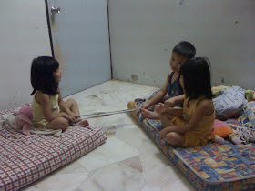 this is shocking! when. I got into the room, I saw this on the floor, when I comb angel's hair, more n more long hair dropping down. finished scolding angel, looked at Eva, pull her away from her seat, wahhhhh more hair cut on the floor!!! speechless! 1st I can't accept they cut their hair week before the kinder concert, 2nd, Eva hiding her guilt, telling lies. they got my sis to punish nicely n I can only throw the pretty nice hair into the dustbin :(